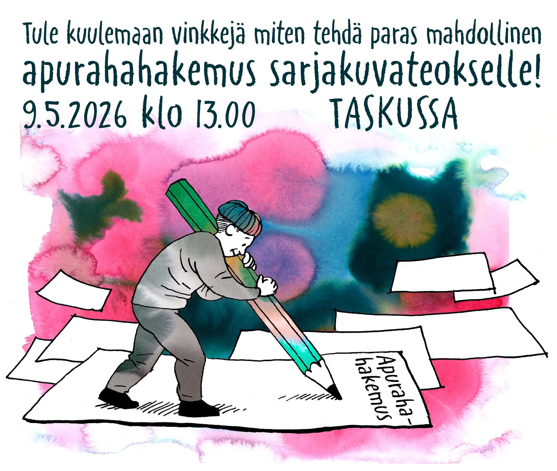 Tule kuulemaan vinkkejä miten tehdä paras mahdollinen apurahahakemus sarjakuvateokselle! 9.5.2026 klo 13.00 Taskussa. Tasku on matalan kynnyksen kohtaamispaikka kaikille sarjakuvantekijöille ja sarjakuvasta kiinnostuneille. Taskun tilat sijaitsevat Kaupin virkatalolla, osoitteessa Parantolankatu 5, Tampere.