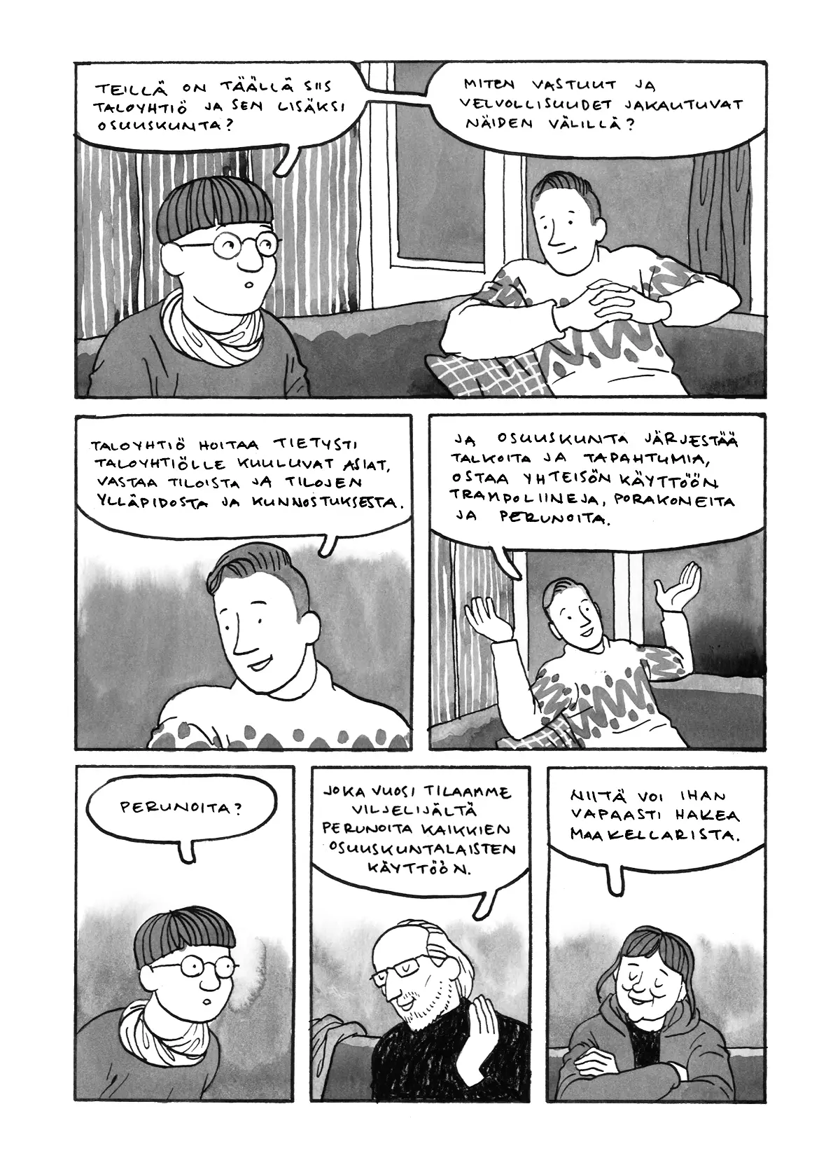 Sarjakuva perustuu haastatteluihin Kotipehkussa ja Hannu Oittisen toimittamaan kirjaan: Alussa oli ajatus – Kotipehkun historiikki 1992-2017 (plus suunnitteluvuodet 1989-1992) sekä Kiinteistölehden 10/2022 artikkeliin Kotipehkussa asutaan yhteisöllisesti.
